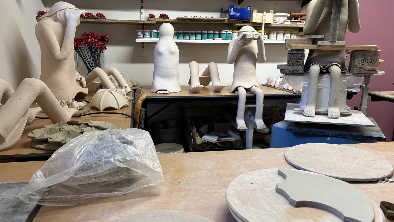 Het atelier van Chris is ook te bezichtigen en er wordt graag een woordje uitleg gegeven ivm het ontstaan en het afwerken van een kunstwerk.Er is om en bij de 300m² exporuimte