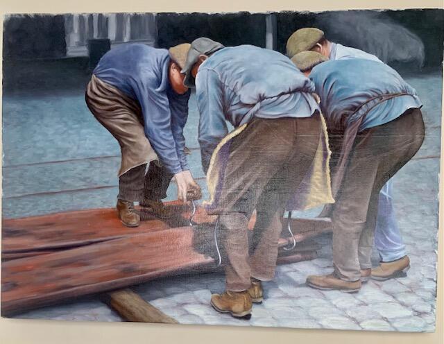 Voor de schilderijen: "Wie heeft dat virus vrij gelaten", "Den Duiker", "Dokwerkers" en "Volksverhuizers", gebruikte Etienne zwart-wit foto's van begin 1900, als inspiratie om terug in kleur uit te werken.