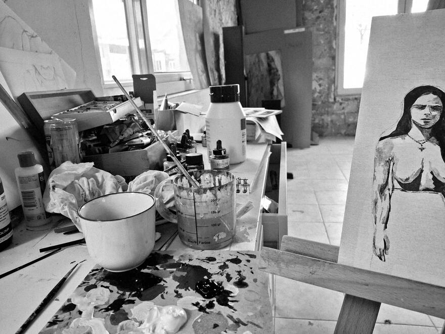 Tussen menstruele cycli, liefdessmart en existentiële crisissen door, werken Adam - Braem onafgebroken in deze schimmelrijke, niet-geïsoleerde plek, doch lichtrijk en ruim. Na een acute astma-aanval werd beslist de broodnodige isolatie aan te brengen (dankzij gastartiest Vader Adam). Het aerosolapparaat, de rode wijnfles, een koffieapparaat en de glimlach van deze twee dames hebben hun vaste plek gekregen.
