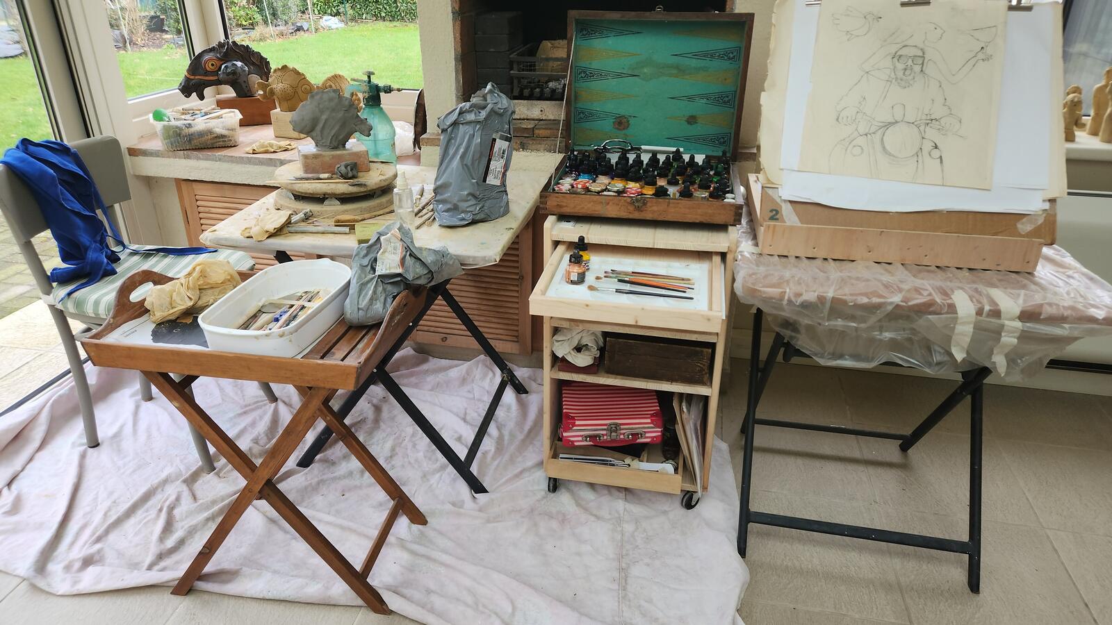 Drie vriendinnen werken samen aan keramiek, schilderijen (pastel, olieverf en acryl), en foto's