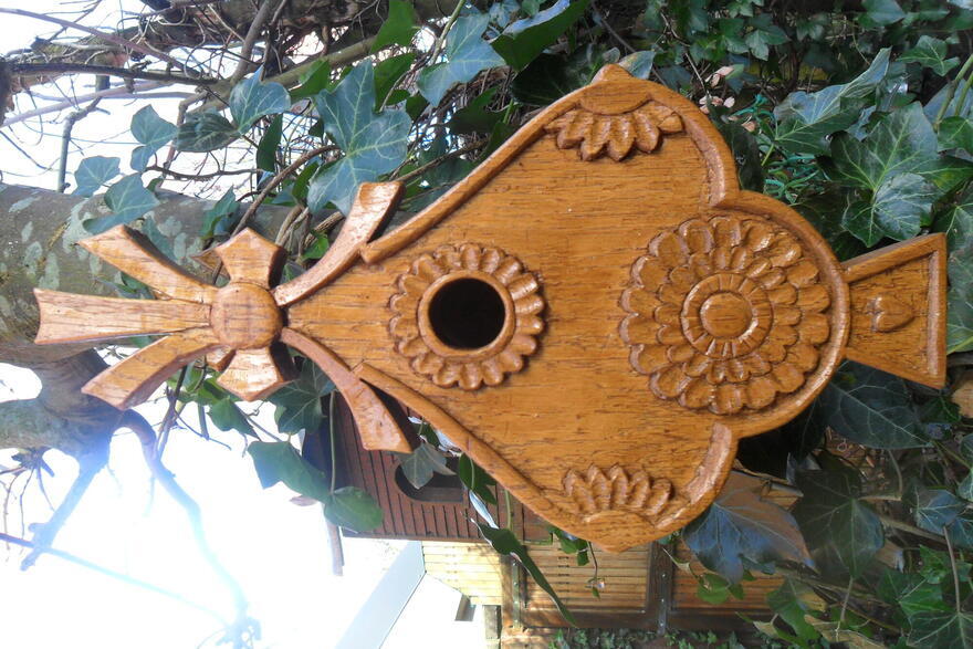 Gerry maakt sierlijk houtsnijwerk, zoals bijenhotelletjes, nestkastjes, panelen...