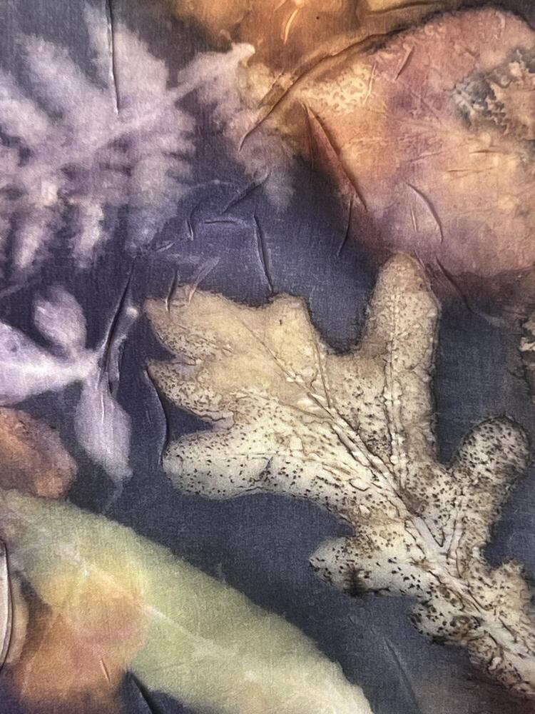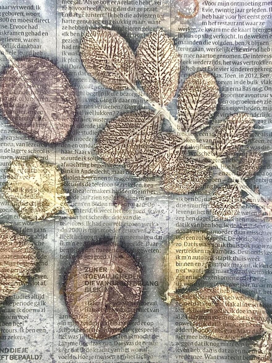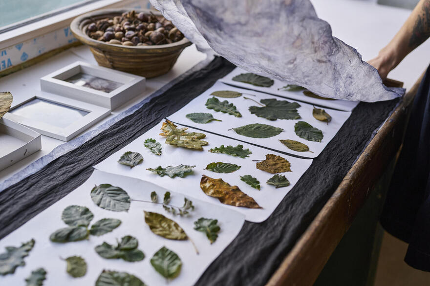In het atelier werkt Annabel met natuurlijke materialen: ze verft met planten uit haar eigen tuin en maakt ecoprints op papier en textiel. Verschillende technieken worden vaak gecombineerd, zoals papier scheppen, vilten, weven, punchen, papier-maché en keramiek.