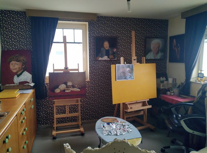 Als persoon met een beperking heb ik ook nood aan een zinvolle dagbesteding binnen mijn grenzen. Al mijn ganse leven passeerde geen dag dat ik niet getekend had. Een aantal jaren geleden besloot ik me volledig te verdiepen in het werken met olieverf.mijn techniek is gebaseerd op de Vlaamse premitieven. Dit betekent zeer geduldig mijn schilderijen opbouwen in talloze (glazeer)laagjes met tussendoor de nodige droogtijd (30laagjes zijn geen uitzondering!) Door die techniek ontstaat een zeer lang en geduldig proces tot ik een voltooid schilderij bekom. Dit duurt snel een jaar per schilderij waardoor ik meerdere werken tegelijk maak.