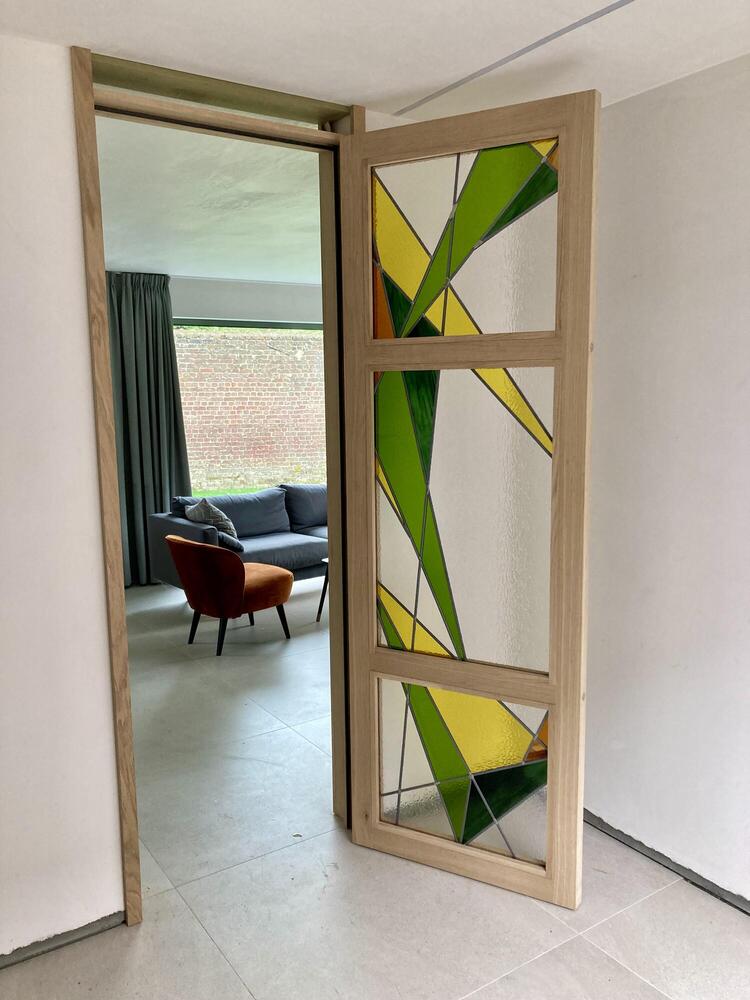 Studio Maes is het creatieve atelier van Bo Maes, glazenier uit Wevelgem. Hier krijgt glas-in-lood een frisse twist: tijdloos vakmanschap met karakter. Samen met Dwaney, onze handige Harry, brengen we jouw ideeën tot leven — van lichtbakken tot binnendeuren. Ambacht, creativiteit en een flinke dosis goesting in elk project.