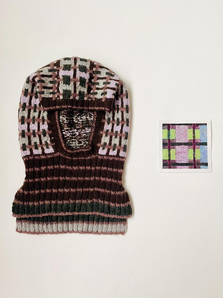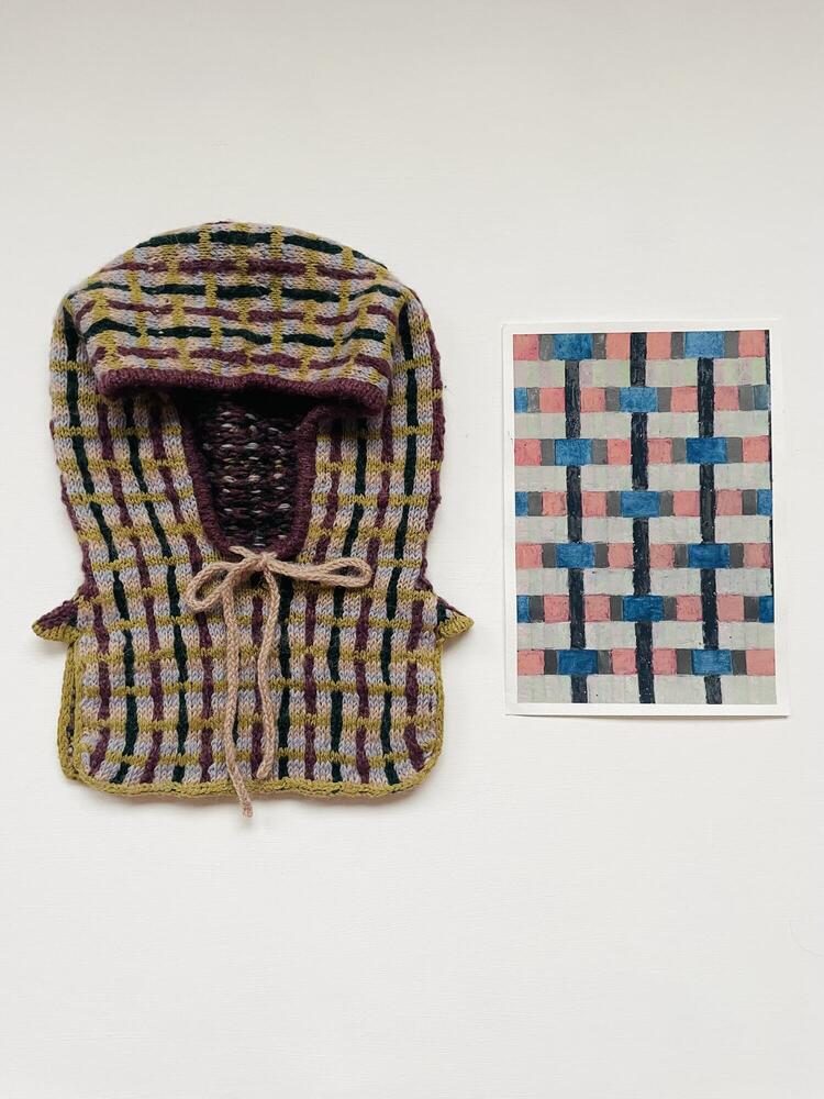 In het breien van een kledingstuk zit veel ritme en regels die gevolgd moeten worden. Je telt je rijen, meerderingen, minderingen en kleuren. Dit vertaalde zich naar een getekend (brei)patroon, een geheime code, voor dat unieke gebreide kledingstuk. Dezelfde regels en ritmes geven vorm aan getekende composities. Ook de grafische patronen en kleurencombinaties werden getest in tekeningen.