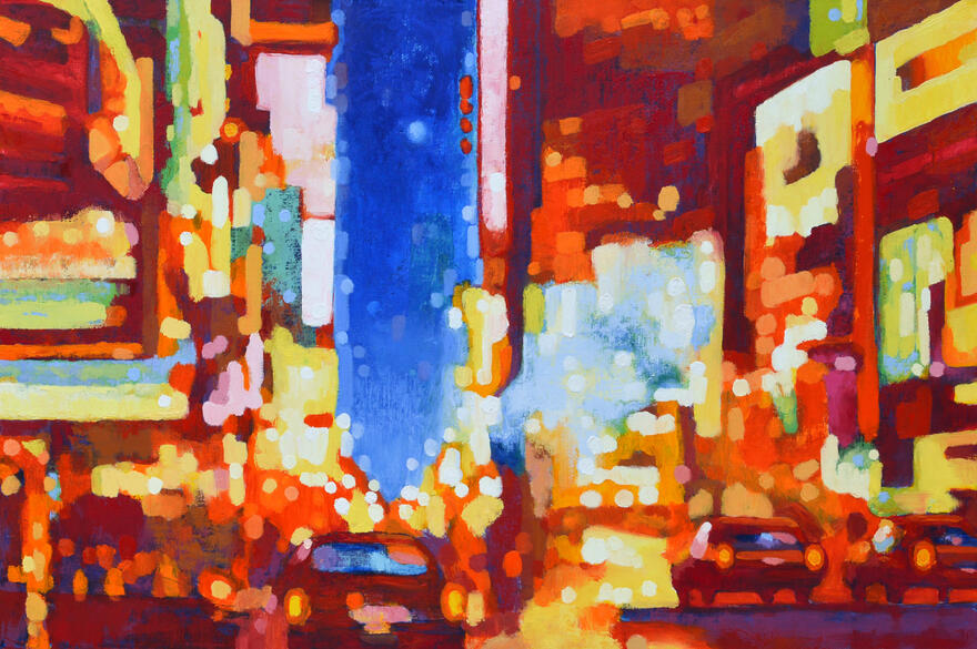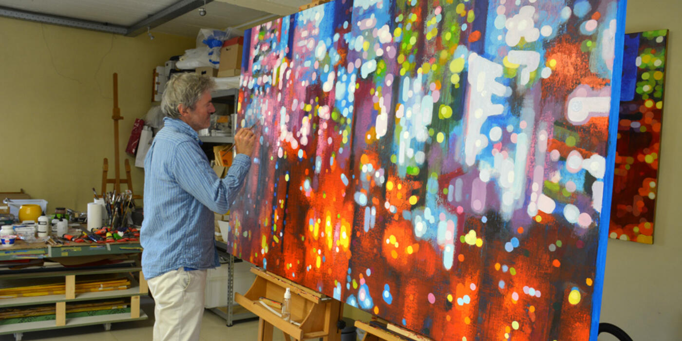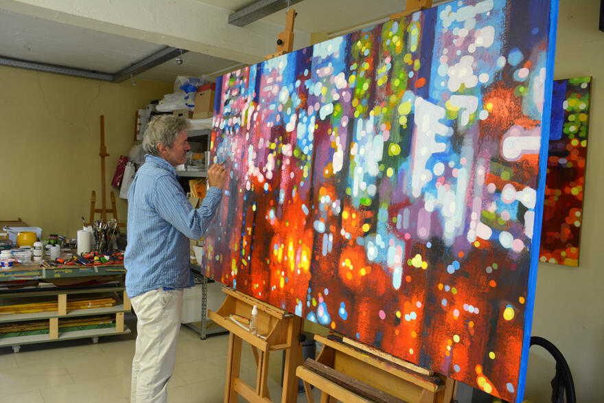 Wie op ontdekkingstocht gaat door het werk ziet een hevig vuurwerk van kleurigheid in een eindeloze variëteit van vormen. Zijn schilderwerken barsten open van energie en vertolken de dynamiek en de levendigheid van de stad.'