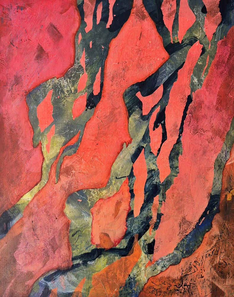 Ik laat me vooral leiden door kleurencombinaties, beweging en experiment. Ik weet waar een werk begint, maar nooit waar het zal eindigen. Een proces waarbij ik, laag na laag, een weg zoek in de constante veranderingen van het beeld.