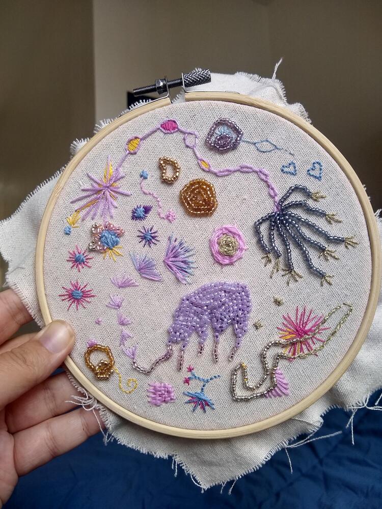 - Works with various mediums like painting, drawing, installation, video, text, embroidery and sculpture.