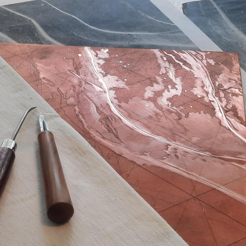 Inspiratie vind ik in oude familiefoto’s en tijdens mijn wandelingen in de natuur. Beide een onuitputtelijke bron van inspiratie. Ik zoek beelden in kleine onverwachte dingen of in de details van de grotere. Mijn favoriete techniek is mezzotint. Deze probeer ik regelmatig te combineren met modern kantwerk.