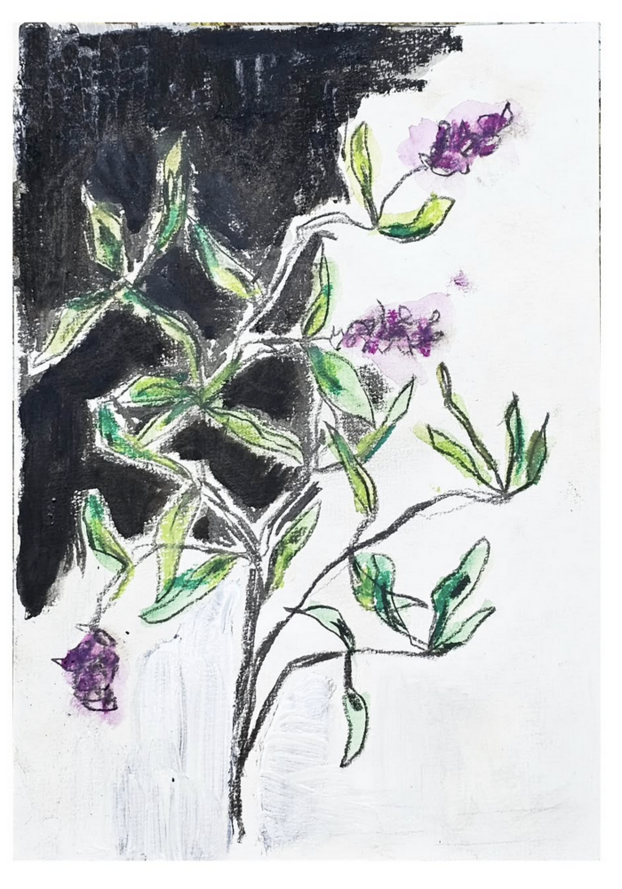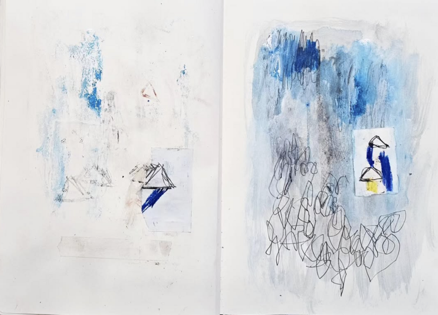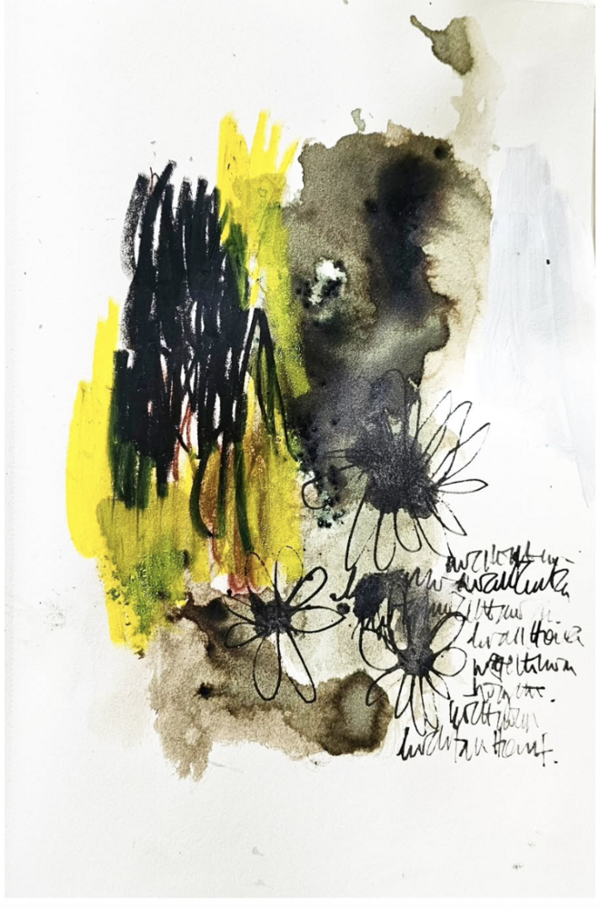 Een instinctieve, impulsieve stroom waarin elk materiaal, elke vlek, elk detail een gelijkwaardige plaats krijgt. Verf, ecoline, bister, inkt, papier, houtskool, water—ze reageren op elkaar zoals mijn gedachten reageren op emoties: vrij, ongedwongen, eerlijk.