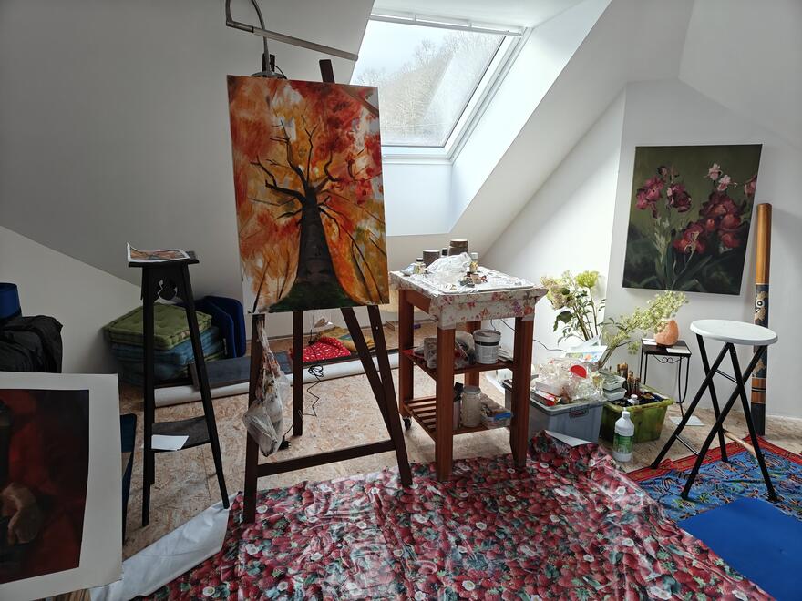 Ik maak kunstwerken met olieverf, houtskool, aquarel, pastel, acryl, inkt… Het atelier is bereikbaar via de gang met trap.