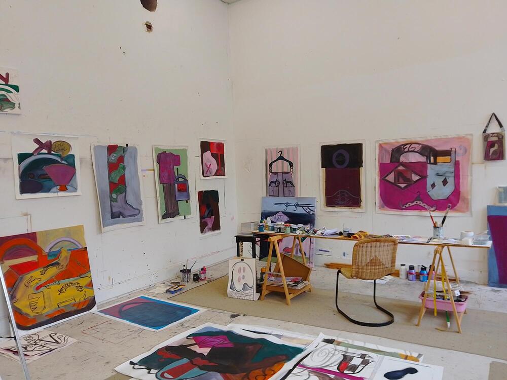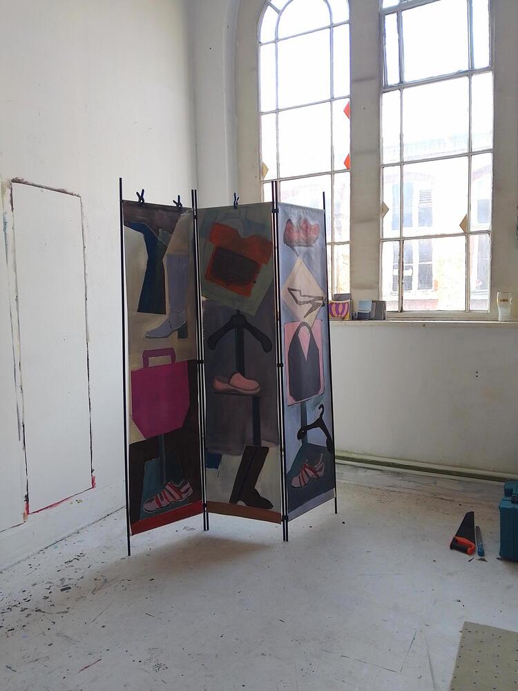Ines Claus (°1993, Antwerpen) studeerde in 2017 af als Master in de Vrije Kunsten aan KASK Gent. In de praktijk vervaagt de grens tussen tekenen, schilderen, collageren, publiceren en installeren. Claus reciteert motieven uit de dagelijkse realiteit, rijkelijk voorzien van frivole krullen en geruite patronen. Met gelaagde en gedurfde composities schetst Claus een taalkundig landschap onttrokken aan de wondere wereld van reclame, mode en meubeldesign. (Credits: Rufus Gallery)