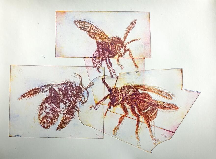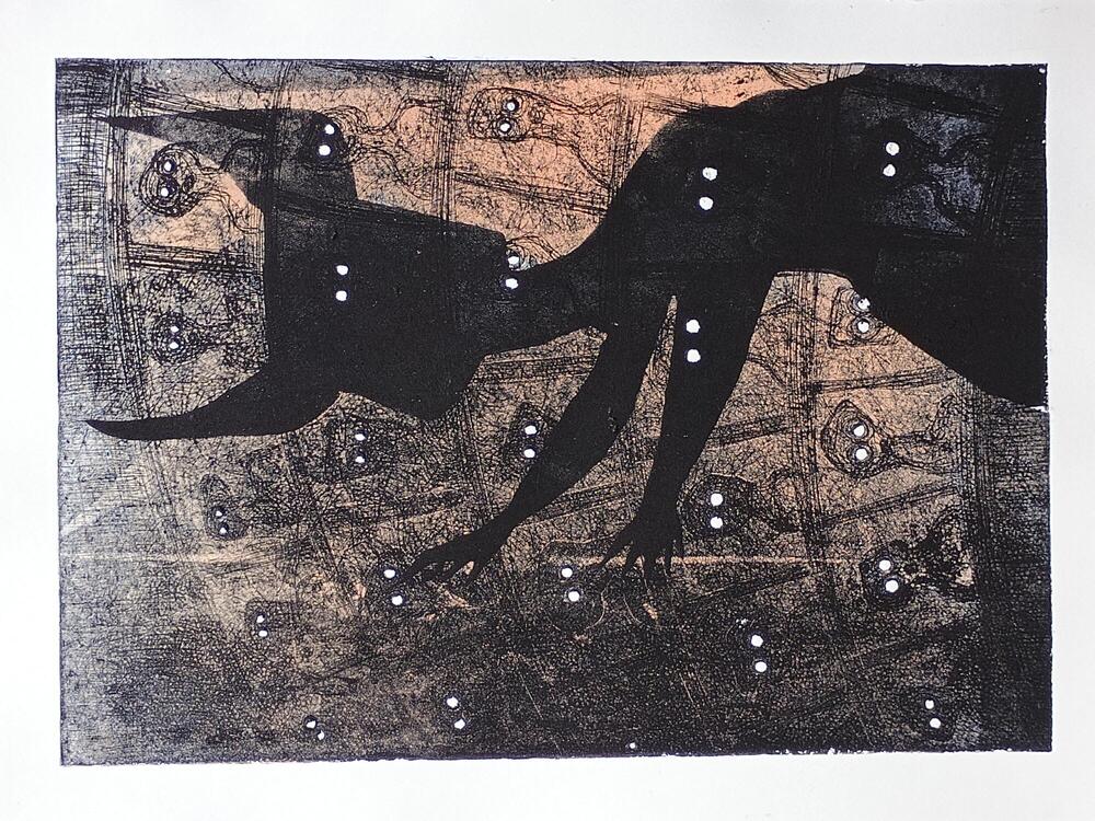 "Paringsvlucht" droge naald, aquatint, collografie, 3 kleuren