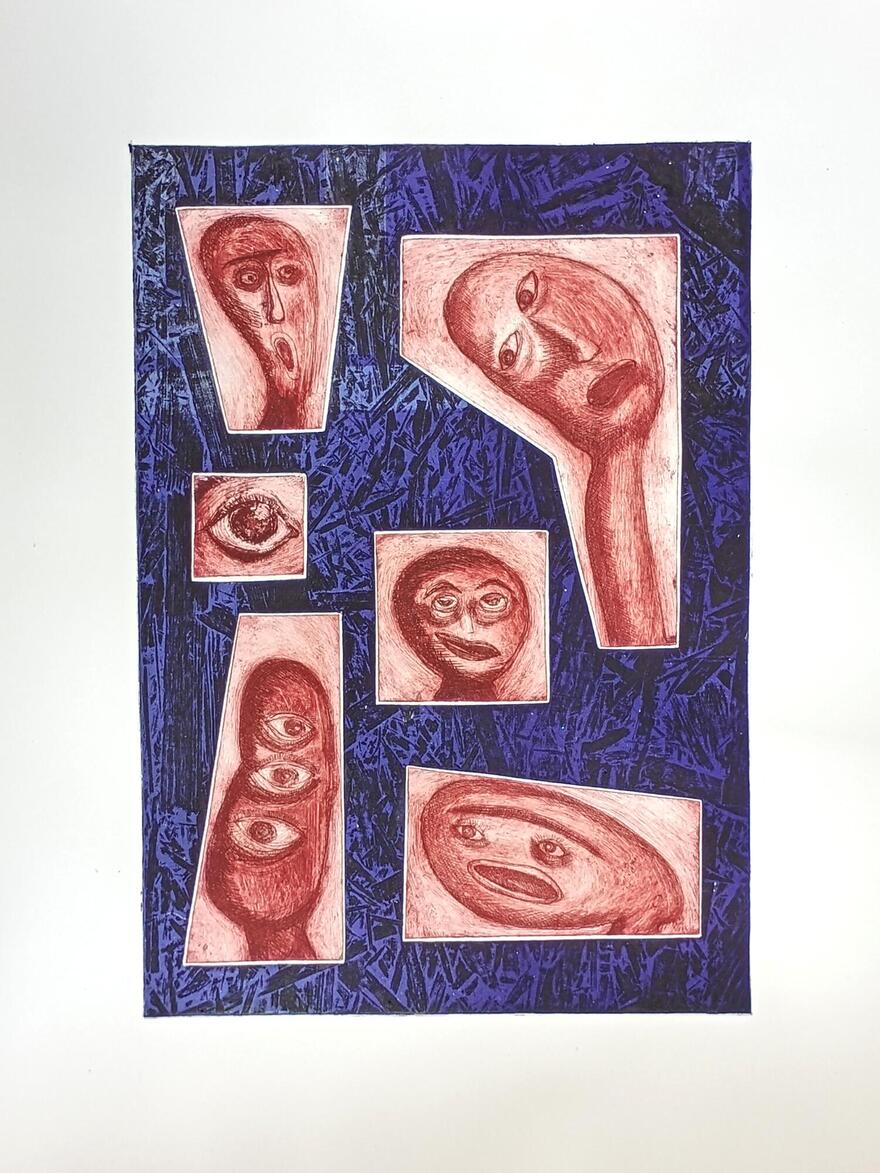 "Killing me softly" ets collografie + hoogdruk kleuren