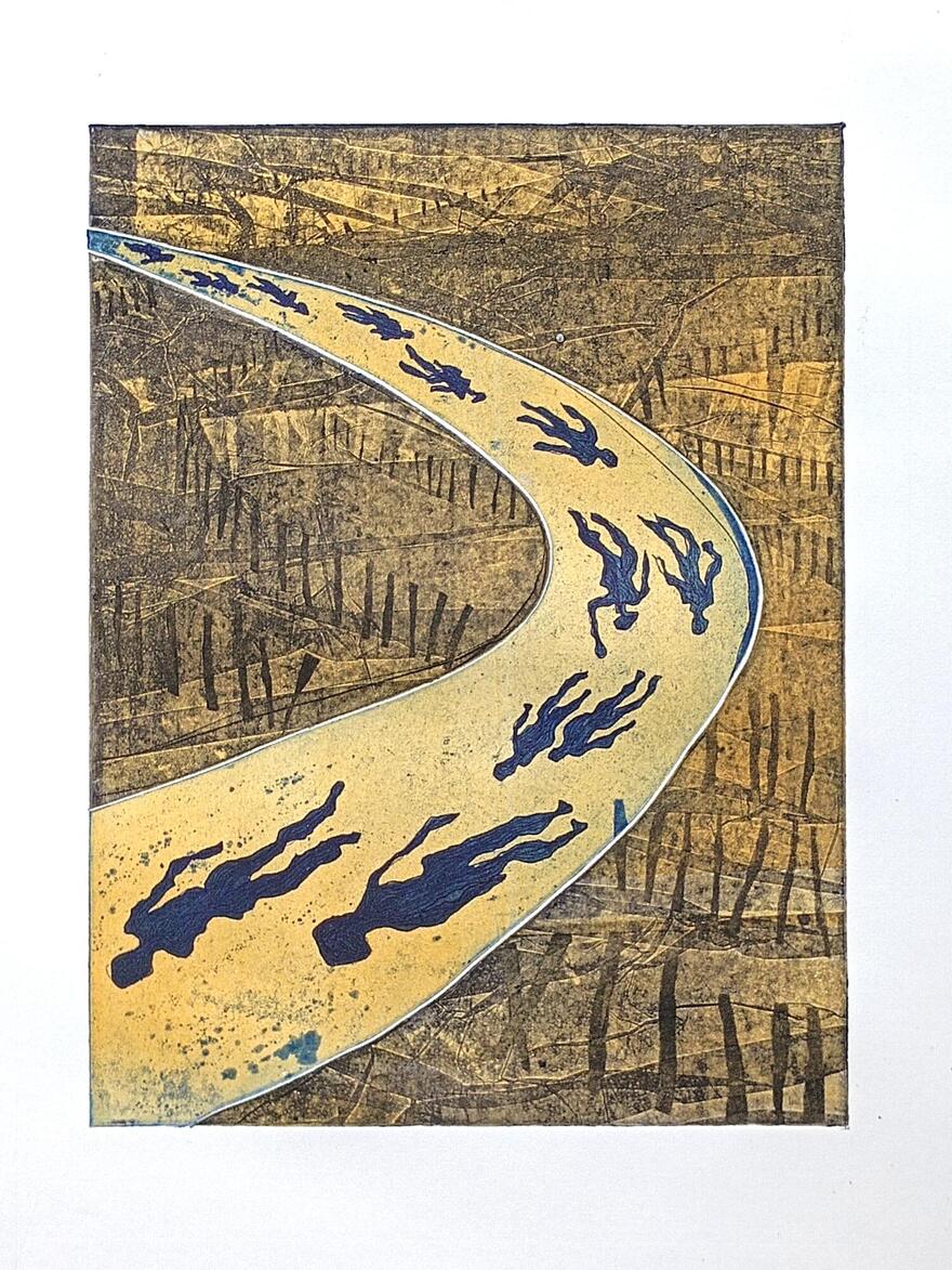 "De stroom" collografie, droge naald, aqua tint, 2 kleuren