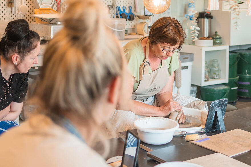 Ik geefworkshops pottendraaien, van eenmalige sessies tot complete lessenreeksen , telkens in een klein groepje met individuele begeleiding.