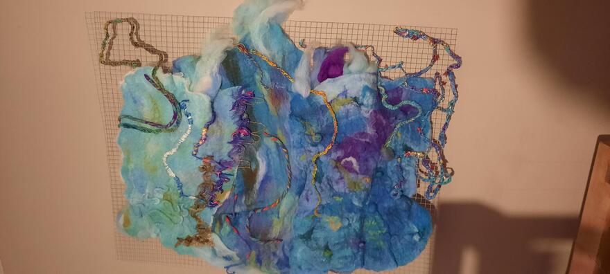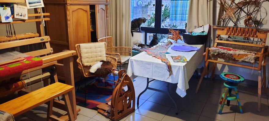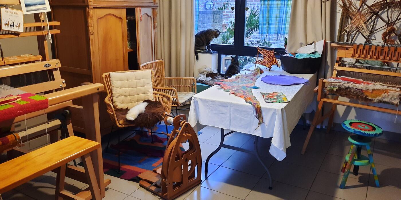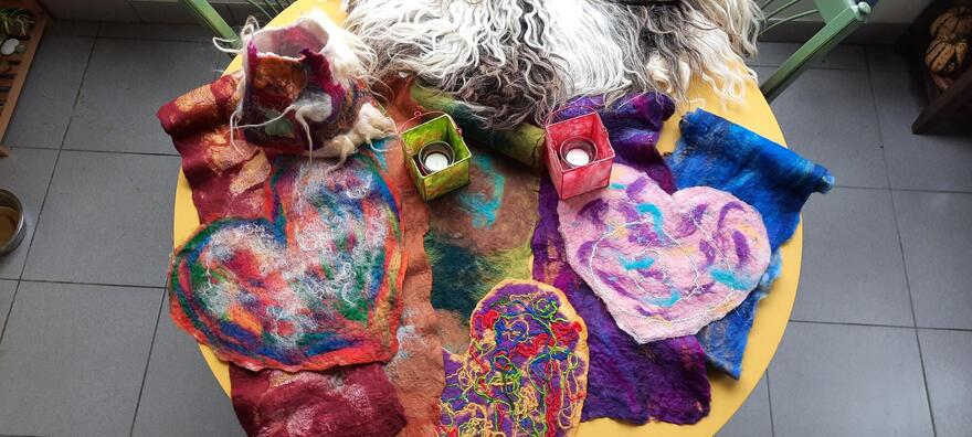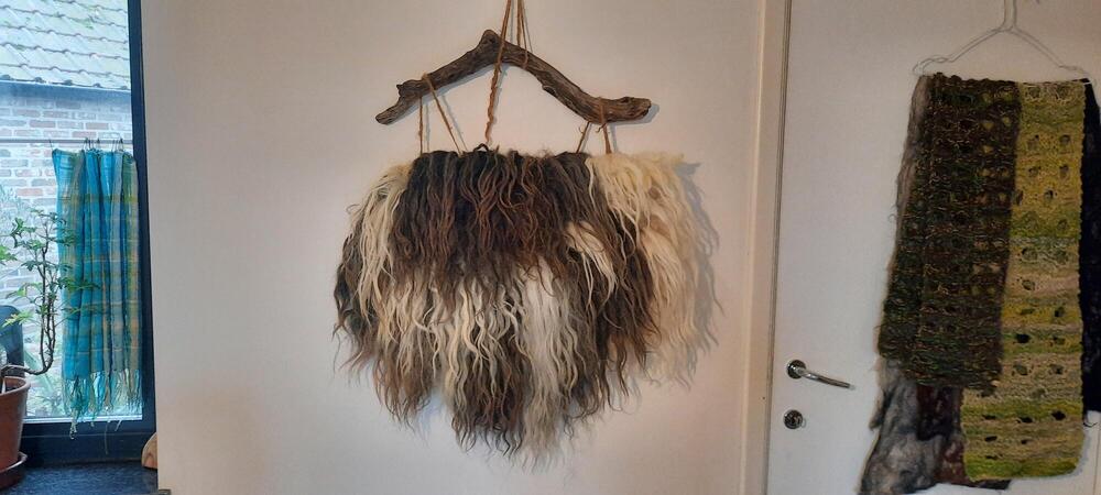 Schapenwol is de rode draad doorheen al mijn creatieve experimenteren. Via spinnen, vilten, weven, borduren, breien, haken,... breng ik mijn levens- en zielspad tot uitdrukking.
