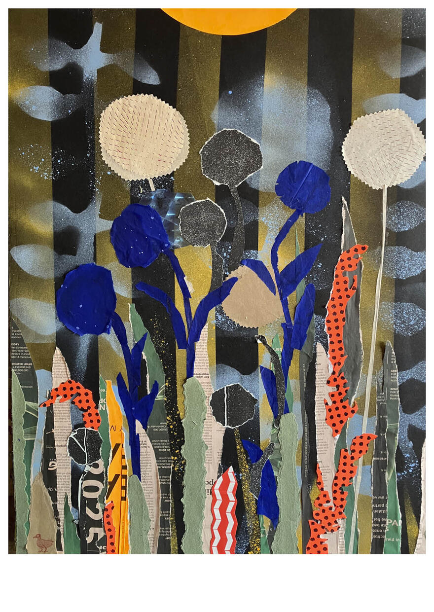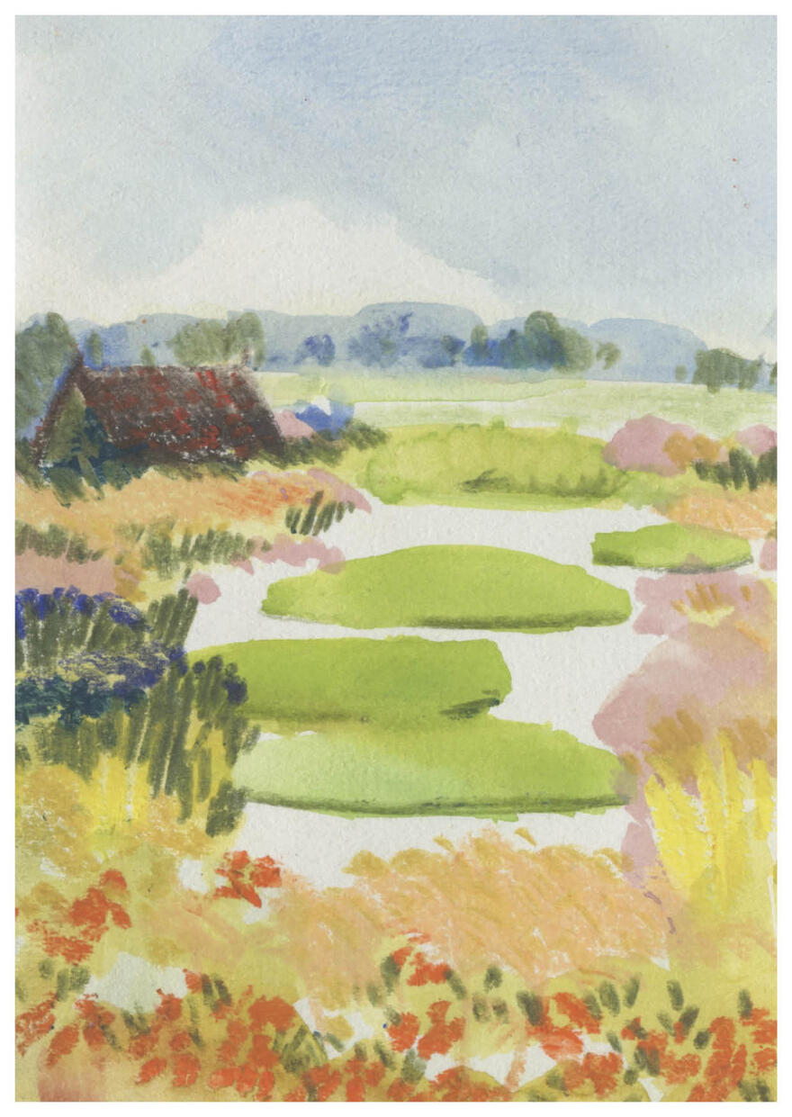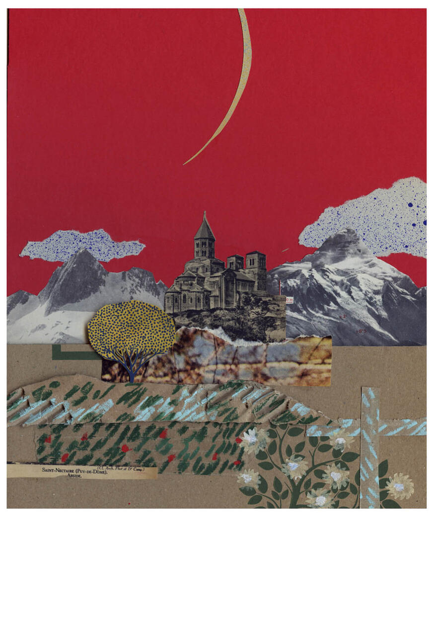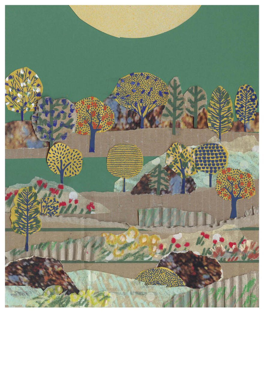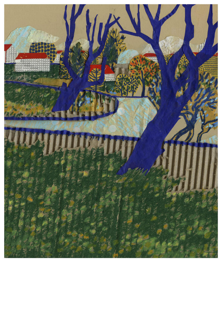 Collages maken op gevonden papiertjes, liefst uit de oude doos, er zijn maar weinig dingen die ik liever doe. Niets gaat verloren, alles krijgt een plekje, snippers worden vormen. Het liefst maak ik landschappen, maar meestal weet ik niet waar ik met mijn papiertjes beland. Ik wil iets moois maken, iets toegankelijk maar ook iets rafeligs. Onverwachte vlekken zijn prettig. Alles gaat door mijn vingers, papier wordt bewerkt met verf of potlood.