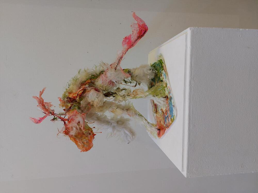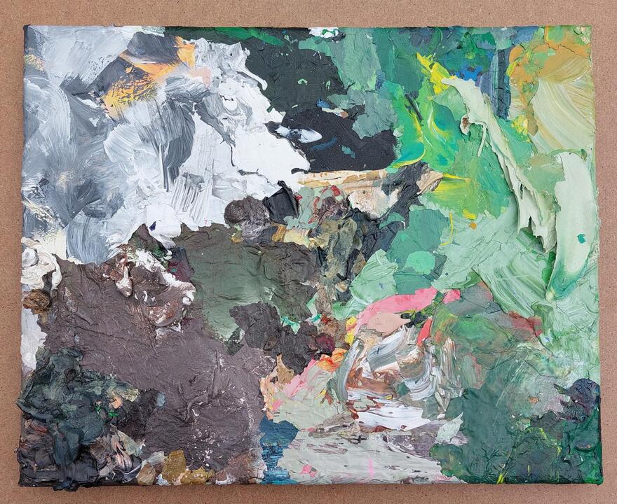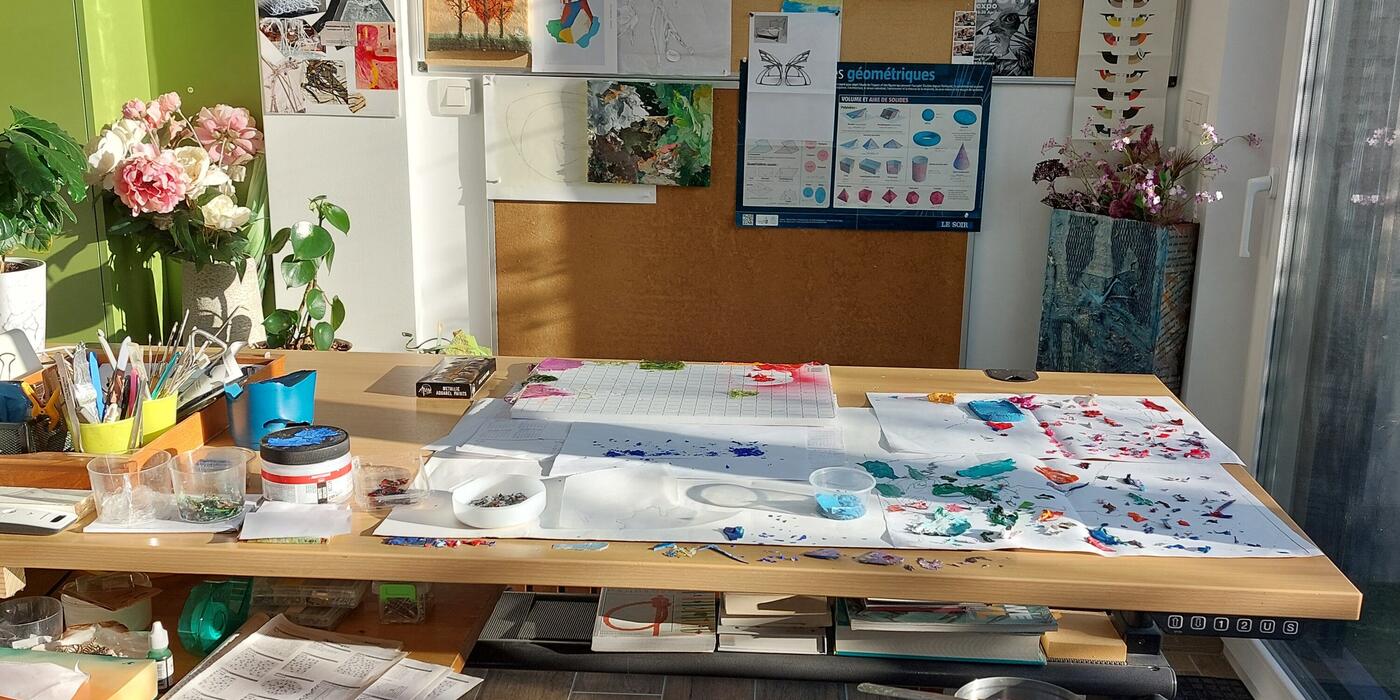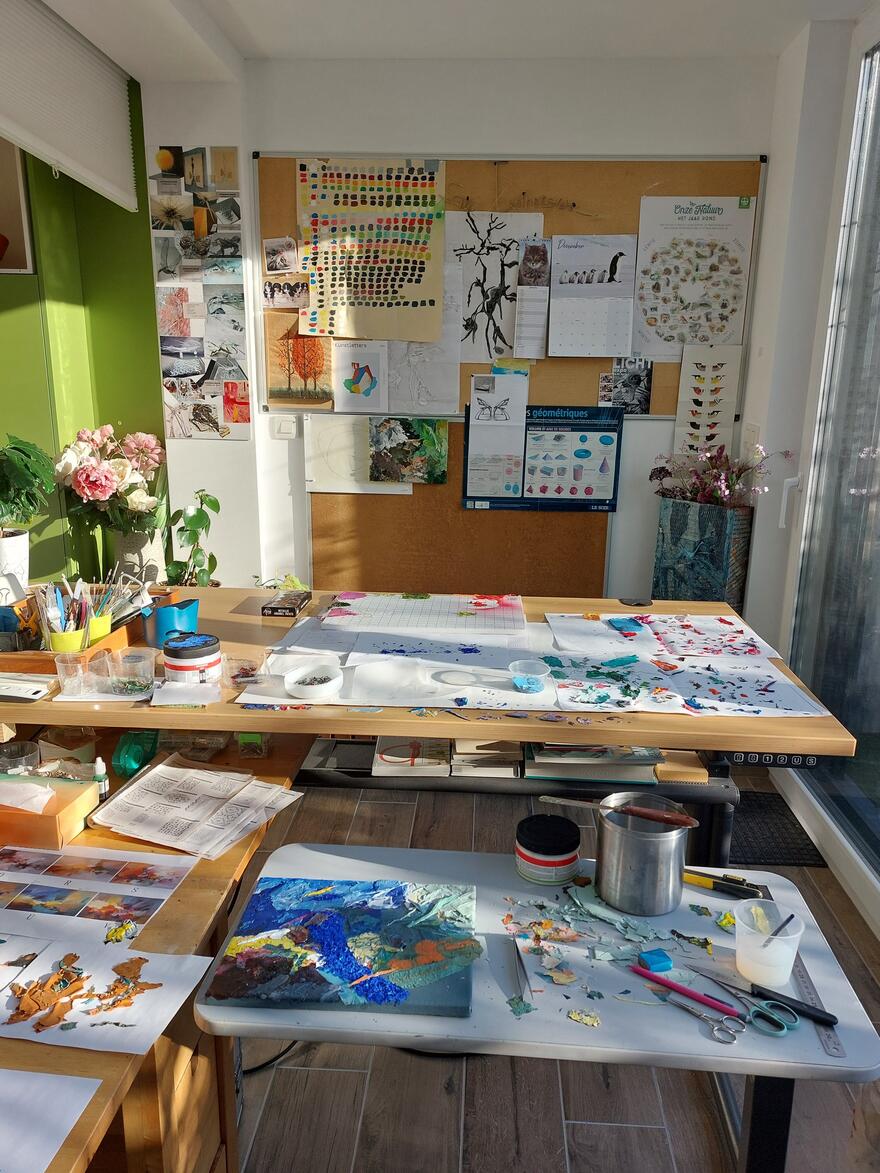materie : al van in het begin vormt 'materie' mijn hoofdthema. Observerend laat ik het materiaal spreken, wat heeft het mij te zeggen, wat zijn zijn specificiteiten. Ik hou ervan betekenis te geven aan iets wat doorgaans wordt afgedankt, een andere betekenis te geven aan dat waar ze oorspronkelijk voor bestemd zijn. Zo zijn dooreengemengde kleuren van verfresten op schilderspaletten mij beginnen boeien toen ik de soms prachtige effecten zag.