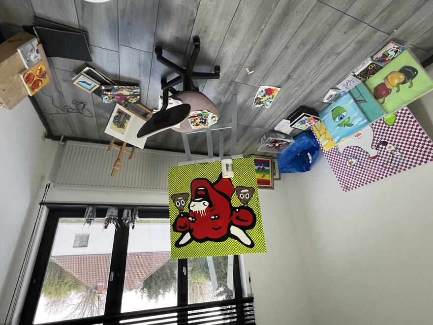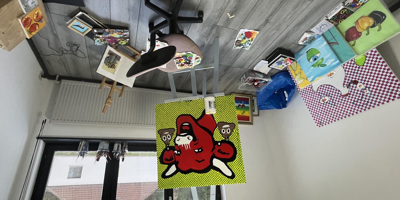 Met een knipoog verwijst hij o.a. naar het surrealisme. De felle kleuren en vooral de humor zijn in elk van zijn kunstwerken verwerkt. Inspiratie vindt Philippe Van Goethem overal. Zo bij grootse kunstenaars, maar evenzeer aan de rand van een zwembad of aan de ontbijttafel. Zijn werk knalt. Door het kleurgebruik, en zeker ook door de gedurfde en ongewone combinaties van figuren. Alles kan, alles mag, niets moet. Hij brengt schilderijen met een ‘hoek af’. Er is niet letterlijk een hoekje af van zijn schilderijen, maar ze belichamen wel het humoristische idee er achter en dat doet ieder van ons er toch even bij stil staan. Een wolk met een zittende dame. Of een omelet in een surrealistische ruimte. Wat niet samen hoort komt samen, wat niet klopt, klopt plots toch. Philippes werk is meer dan acryl op papier of doek. Het is een verhaal, een dromerij. En vooral: een uitnodiging om te stappen in een bonte fantasiewereld.