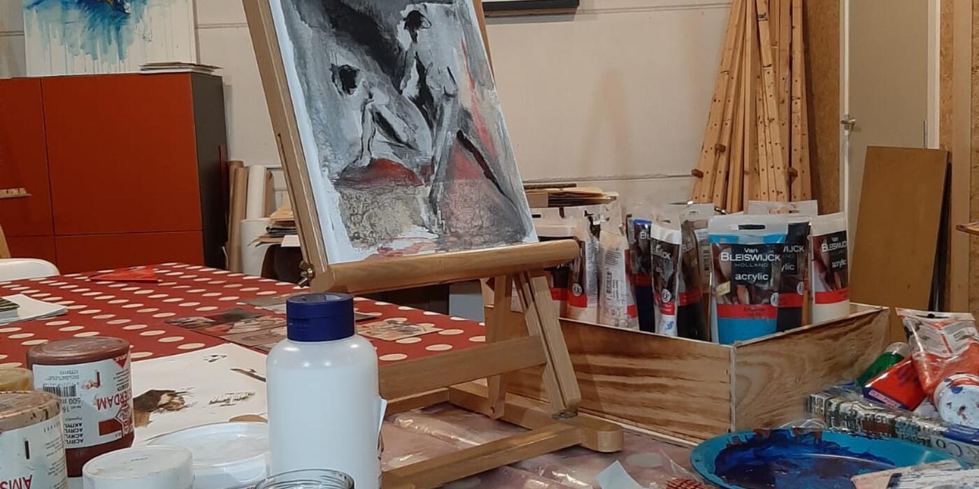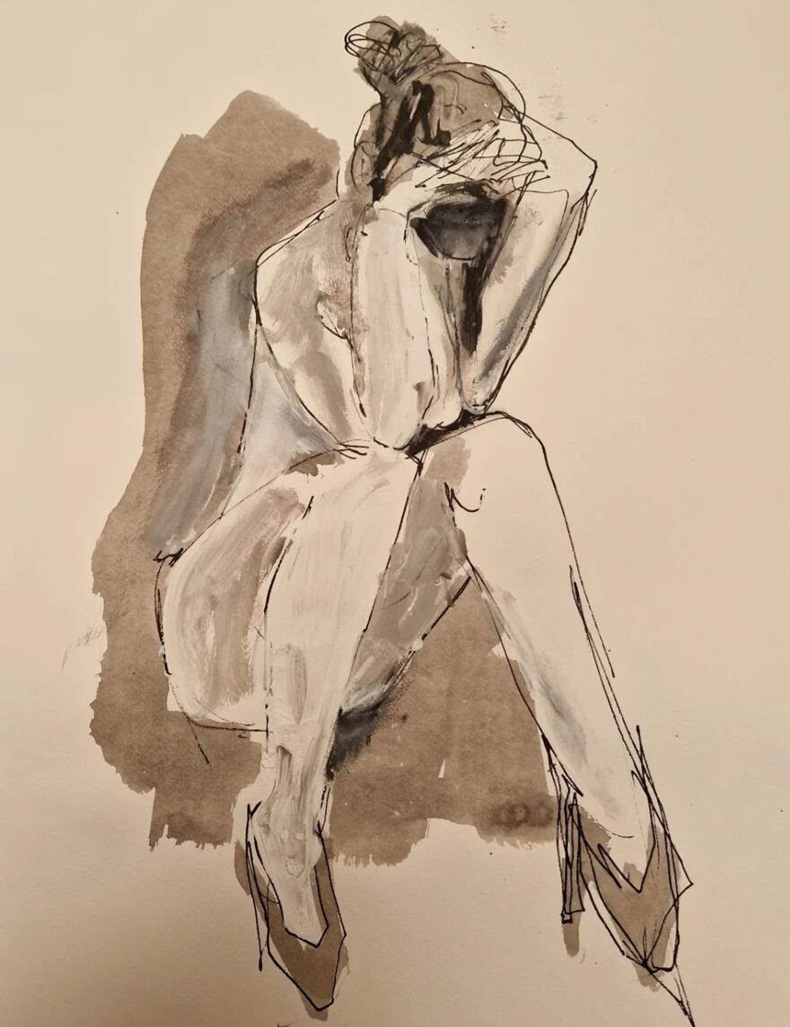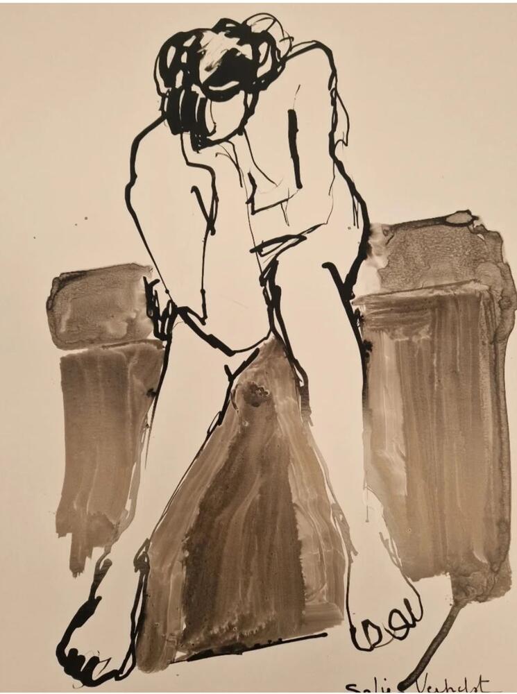 Sofie Verhelst is kunstenaar en interieurarchitect. Ze werkt vaak naar levend model en onderzoekt via silhouet en lichaamstaal kwetsbaarheid en verbinding. Met inkt, houtskool, collages en druktechnieken staat het proces centraal.