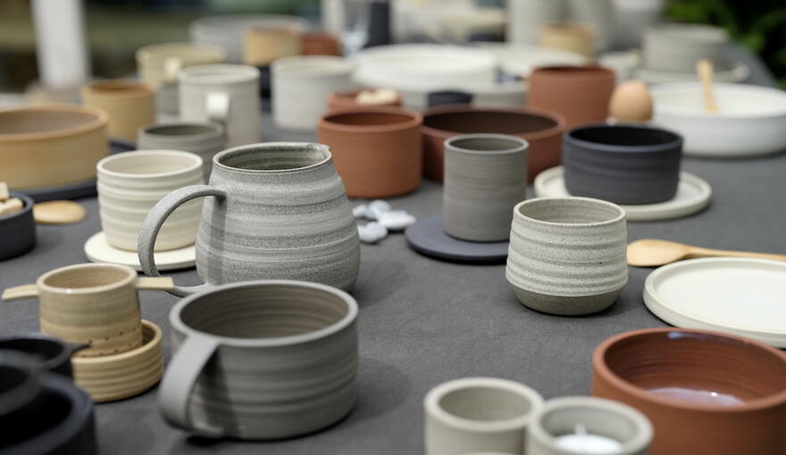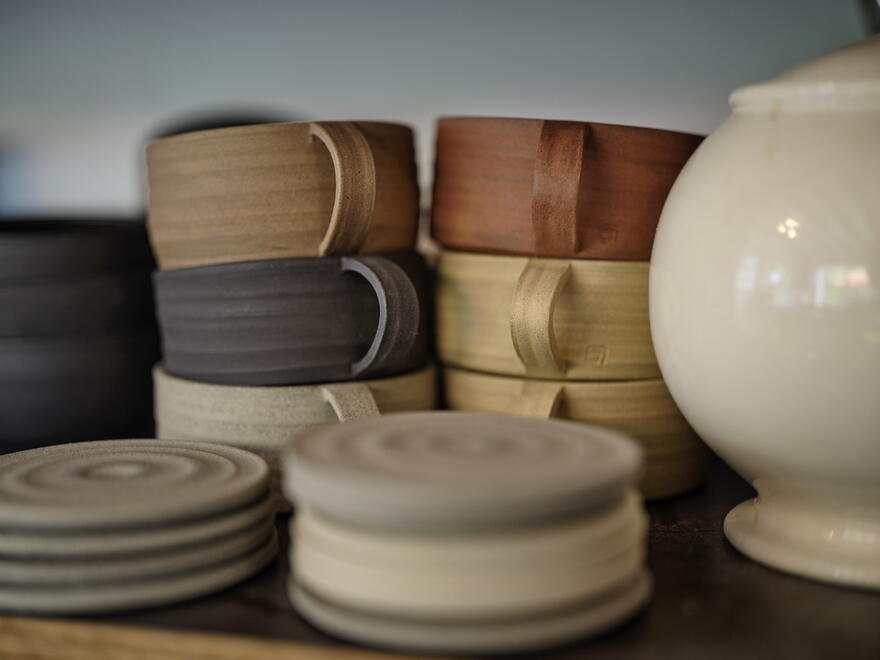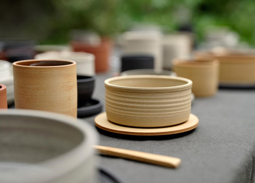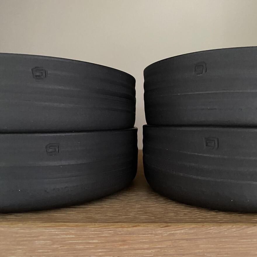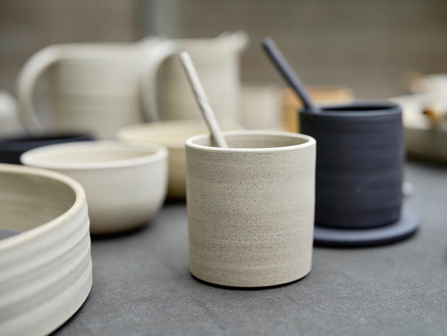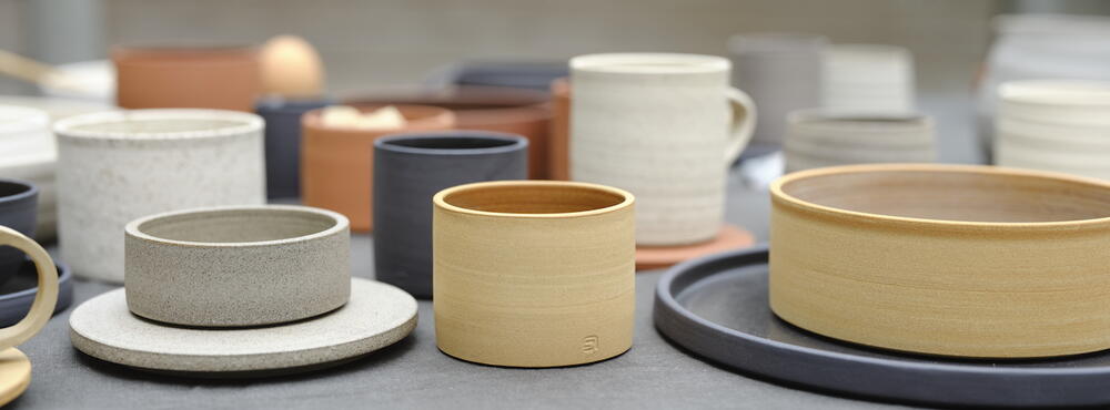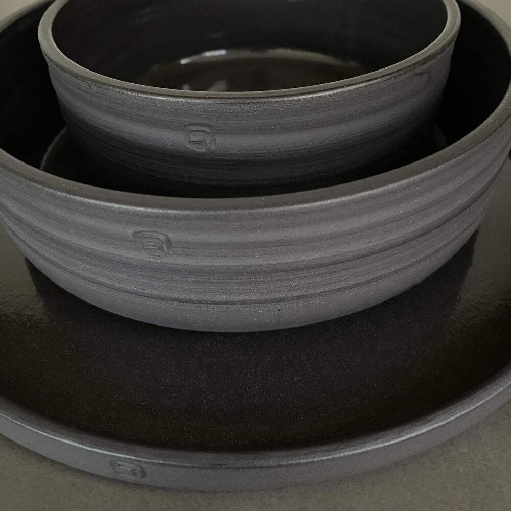 Handmatig vervaardigd op de draaischijf uit (natuurlijke) kleisoorten en op hoge temperatuur gebakken waardoor de scherf volledig dicht is gesinterd. Alleen de binnenkant van het werk wordt geglazuurd. Buitenkant van het werk voelt aan als gepolijste steen.
