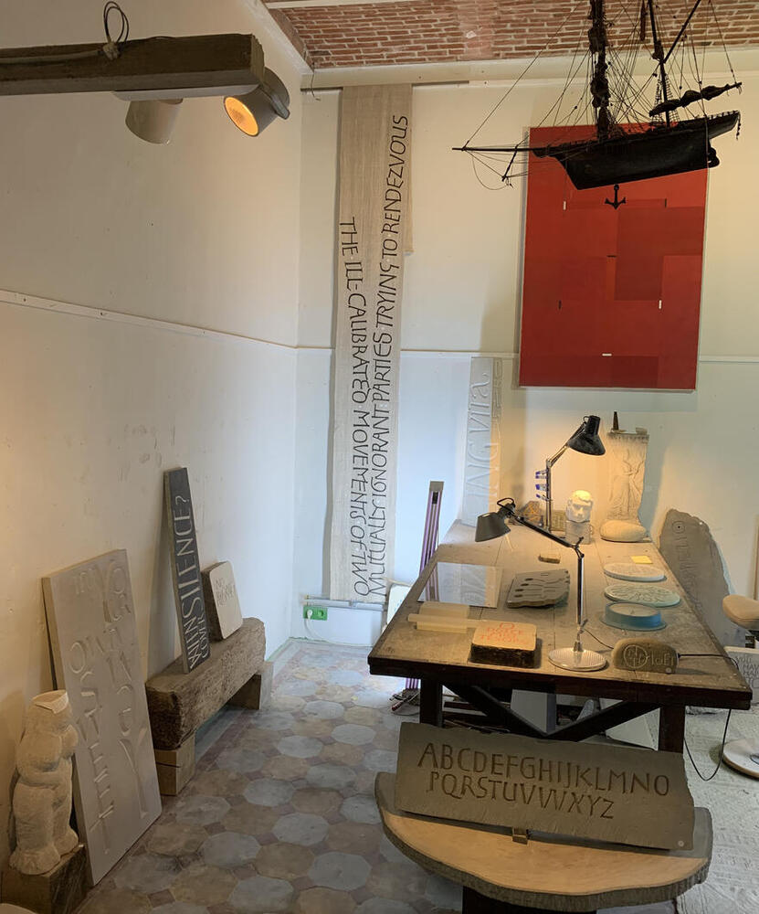 Kristoffel ontwerpt letters en kapt ze in steen. Hij tekent en schildert ook, maakt hij beeldhouwwerk in steen en schrijft.